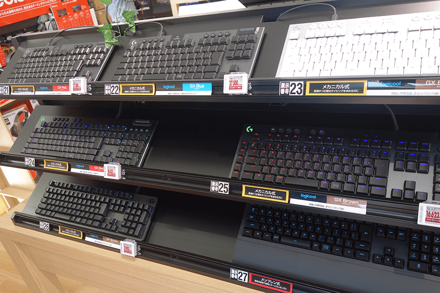 ドスパラの新しい店舗シリーズのコンセプトは「体験型」です。現行売られているほぼ全てのゲーミングデバイスがお試しできます。まずはゲーミングキーボードのコーナー。