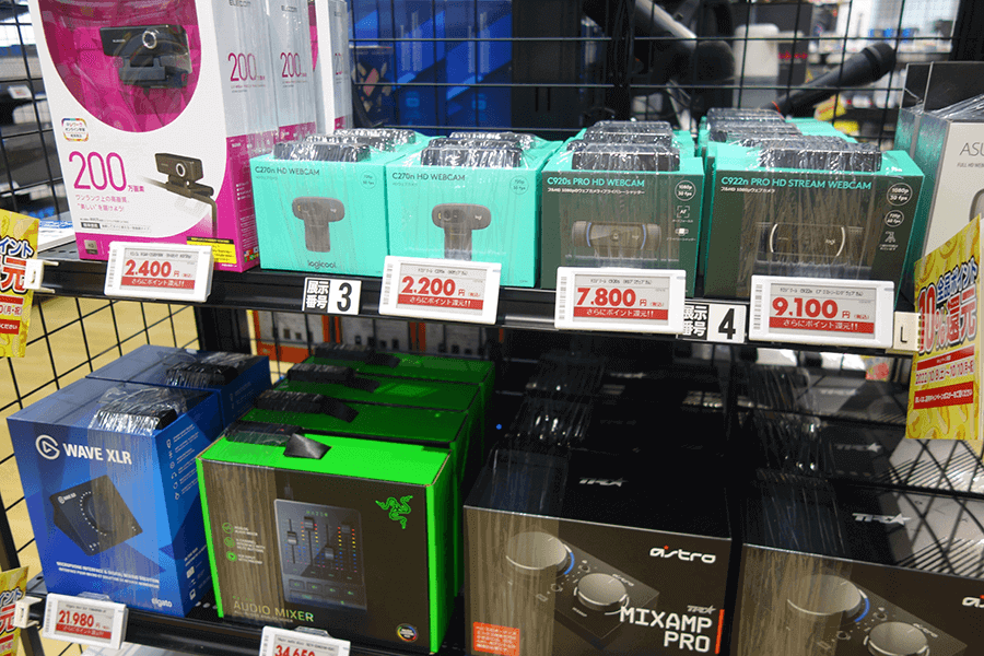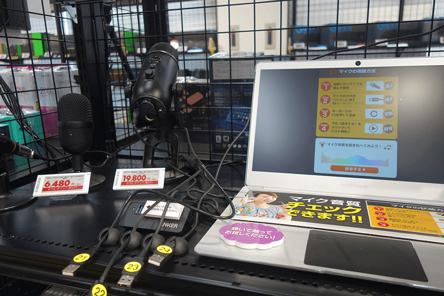 配信用のマイクもあります。これも試せます。もう試せないデバイスは無いのではないでしょうか…!! さすが体験型パソコンショップの冠はダテではありません。