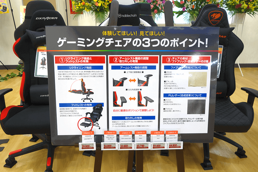 ゲーミングチェアは6脚ほどお試しできるようになっていました。3つのポイントの解説があります。