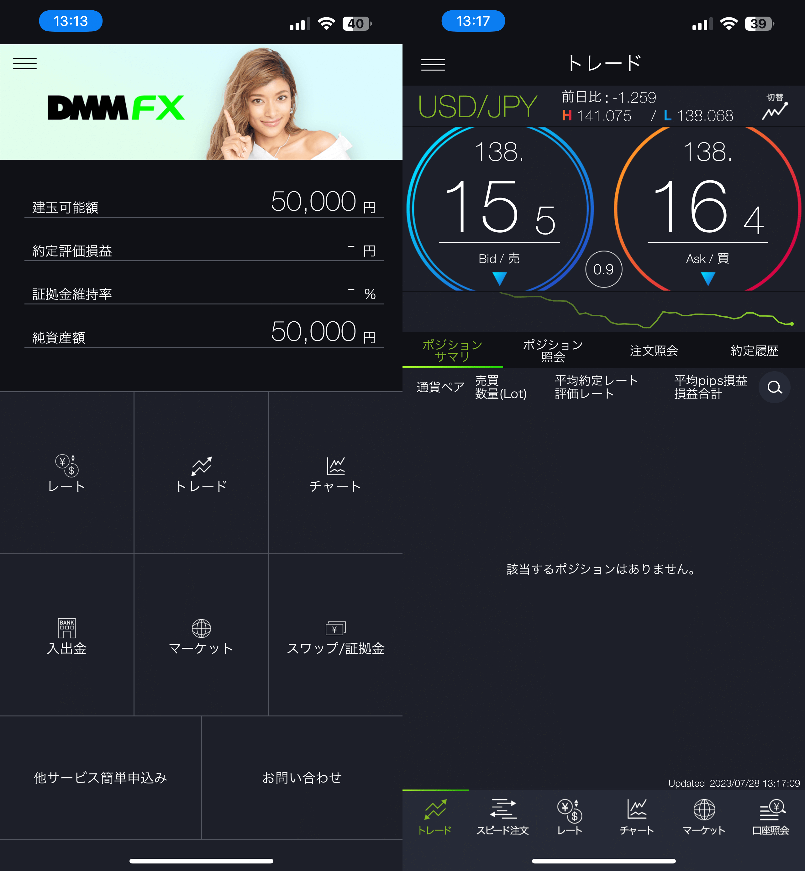 !!50,000円無事に入っていますね。本当にスムーズです。メニューのトレードをタップしてみると、USD/JPのレートが表示されています。ここから取引ができる、という訳です。